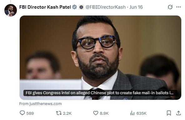 Congress is the recipient of an intelligence report from FBI Director Kash Patel with allegations that China planned to mass-produce U.S. driver’s licenses in an attempt to affect the 2020 election to favor Joe Biden. If true, the report states that the fake licenses would have been used to facilitate fraudulent mail-in ballots.